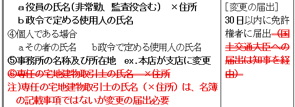 ⑥専任の宅地建物取引士の氏名 ×住所 | 注)専任の宅地建物取引士の氏名(×住所)は、名簿の記載事項ではないが変更の届出必要 ※差し替え |