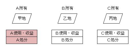 上図を見て下さい。今、A・B・Cが、それぞれ甲地・乙地・丙地を所有していたとします。この場合、所有権というのは民法で勉強しましたが、「使用・収益・処分」する権利ですから、甲地・乙地・丙地について、それぞれA・B・Cが所有権(使用・収益・処分権)を有しているというのが上図です。
