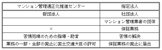 最後に、マンション管理適正化推進センターとマンション管理業者の団体(指定法人)との比較の表を掲げておきます。